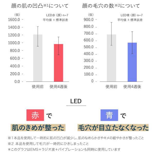 肌悩みに合わせて切り替え可能な2色のLEDライトが使用できます。赤色と青色のLEDライトを4週間使用し、使用前後で比較したところ、赤色ライト使用後は肌の凹凸数が減少し、肌のきめが整い、青色ライト使用後は、毛穴の数が減少するという結果となりました。