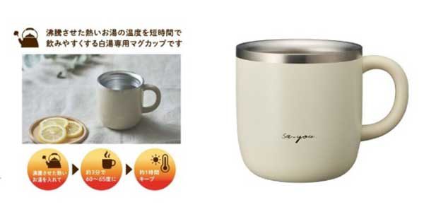 吸熱構造で、熱湯の熱を素早く吸収し、白湯に適した温度で温かさが長持ちします。沸騰させたお湯を約3分で白湯に適した温度に下げるので、長時間待つ必要がありません。