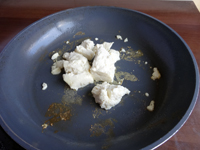 (2)フライパンにごま油を入れ、粗くほぐした豆腐を焼き色がつくまで焼き、取り出しておく。 |