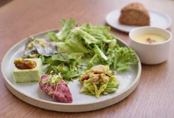 ビーツのルビーポテトサラダ、メカジキ藁焼きと若竹のシークワーサーソース、豚タンと仙台せり新玉葱の甘酢あんかけ、春キャベツとホホホタケの牡蠣味噌和え、ずんだ豆腐(黒ニンニクとワサビのソース)、スコーン or十穀米、季節のスープ