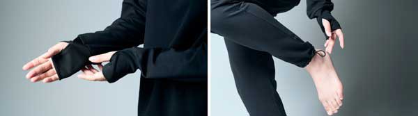 トップスは、指穴付きで寒い時には手まで覆うことが出来ます。パンツは、調整ストッパー付きで暑い時には裾の長さを調整出来ます。