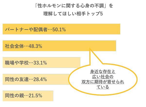 性ホルモン不調について「自分の不調を理解してほしい相手」としては社会全体とパートナーがそれぞれ約5割と高く、最も身近な関係性と広い社会の双方に期待が寄せられていることが明らかになりました。