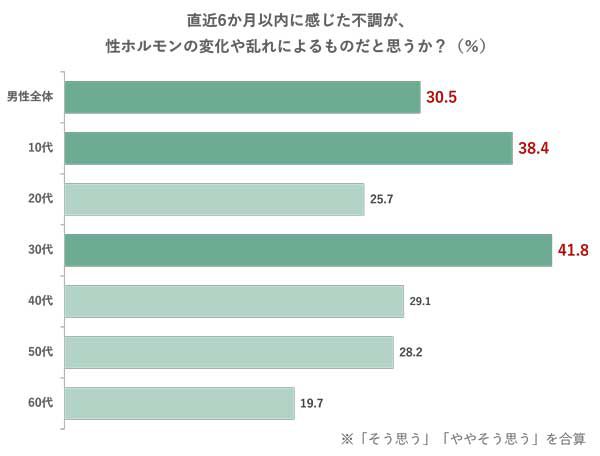 対して、男性は全体の約7割が直近6ヶ月以内に不調や変化を経験しているにもかかわらず、それを性ホルモン変化と関連づけられた人は3割台にとどまる結果に。今年度の「骨太の方針」に初めて記載された「男性更年期」。男性更年期は40代以降で症状を感じる人が多い傾向にあり、どの年代にも症状が起こり得るという点では女性の更年期と異なりますが、自身の体の不調の原因に「性ホルモンの変化や乱れ」が関係している割合は、全年代において、相対的に女性より低い結果になっています。