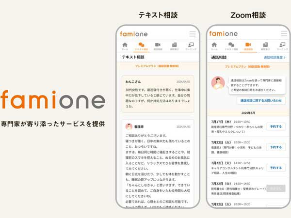 株式会社ファミワンと連携し、看護師・薬剤師・臨床心理士など50名以上の専門家へ、テキスト&ビデオ通話で無料相談できる。体調管理や妊活をはじめ、あらゆるお悩みや不安に専門家が伴走。