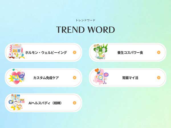 「ホルモン・ウェルビーイング」「養生コスパワー食」「カスタム免疫ケア」「胃腸マイ活」「AIヘルスバディ(相棒)」のワードごとに、それぞれのテーマに沿った商品ブースでの体験やサンプリングを実施し、参加者に提供。今押さえておきたいヘルスケアの最前線を実際に体験してもらうことができるイベントです。